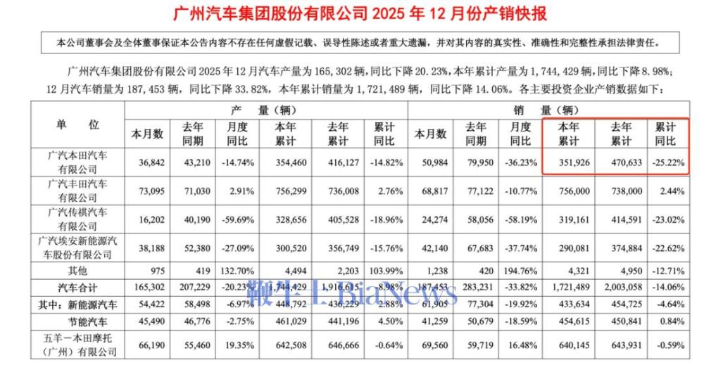 近日,广汽集团2025年功绩预报迎来“暴跌”,瞻望净利润最高亏欠90亿元,其立下的230万辆销量主义也未能完成。广汽本田无疑是广汽集团最大的“拖油瓶”。为止客岁年底,广汽本田累计销量35.19万辆,同比下落25.22%,成为集团销量降幅最大的品牌。